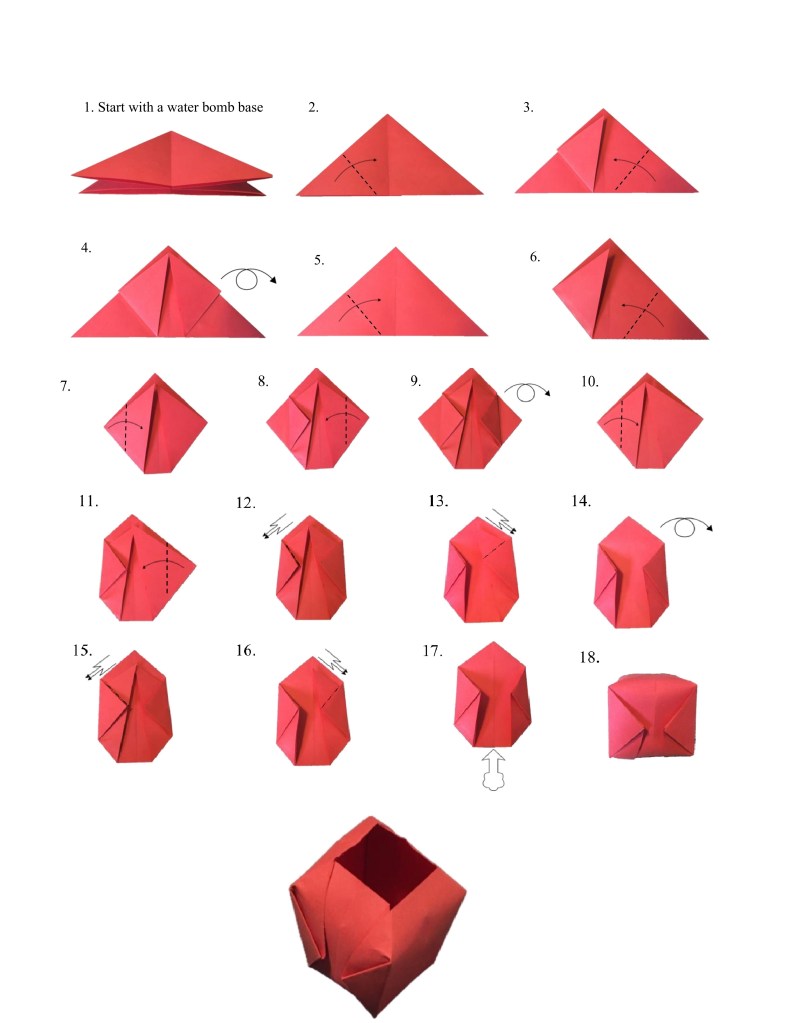 This week, I learned about the Yoshizawa–Randlett System. This system was created by Yoshizawa, then translated and organized by Randlett. This system is now considered as an international standard. These symbols can be found on Wikipedia: Yoshizawa–Randlett system